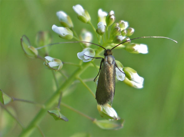 Hirten-Täschelkraut (capsella bursa-pastoris) mit Langhornmotte nemophora metallica → Langhornmotten-im-Glemstal |