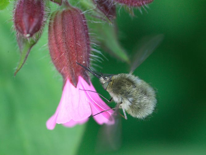 | rote Lichtnelke (silene dioica) und grosser Wollschweber (bombylius major) → Wollschweber-im-Glemstal |