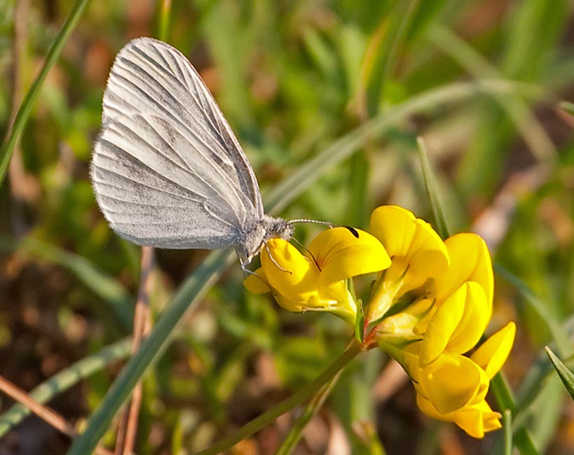 Hornklee (Lotus corniculatus) und ein Senfweißling (Leptidea sinapis oder Leptidea reali). Er saugt am Hornklee. ...mehr über unsere → Weisslinge im Glemstal → NSG Hammelrain in Markgröningen |
