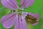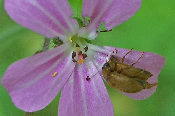 Ruprechts-Storchschnabel (Geranium robertianum) mit Himbeerkäferpaar (Byturus tomentosus) mehr zu Käfer-im-Glemstal |