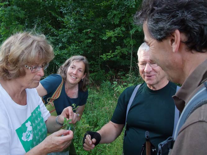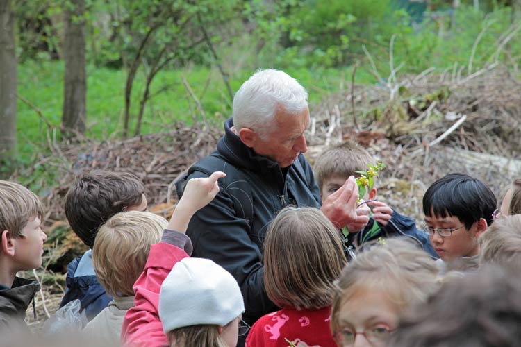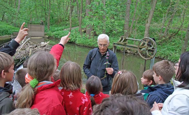 Günter Breuer erklärt, dass die Goldnessel-Blüte süß schmeckt |