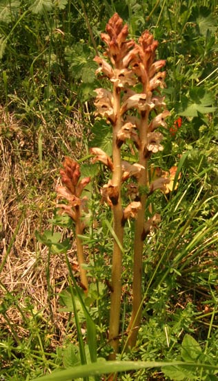 Der Orchideenexperte Steffen Hammel schreibt mir am 26.2.2012: "Bei den folgenden Fotos handelt es sich nicht um Orobanche alba, sondern um O. caryophyllacea (Labkraut-Sommerwurz)! Das passt auch mit der Aufnahme links zusammen, da hinter dem Salbei - soweit ich es erkennen kann - auch die Wirtspflanze Galium wächst."