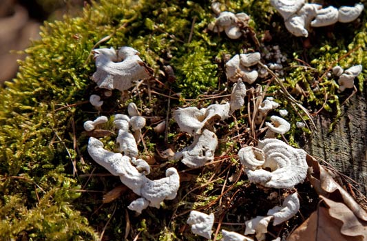 linke Seite: "Ziegenbärtchen" (weiß): Geweihförmige Holzkeule (Xylaria hypoxylon) (Danke an Rotraut Völlm für die Artbestimmung in 11/2012) Ordnung: Holzkeulenartige (Xylariales) |