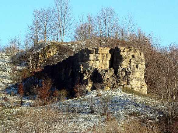 ... mehr Mehr über den Steinbruch in Markgröningen im Glemstal [Foto: der Fels am Eingang im Schnee am 20.12.2004]