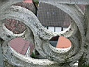 der Wasserspeier am Turm der Georgskirche von unten; Das Geländer mit der Zahl