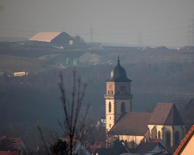 Die Georgskirche, dahinter die Erddeponie Froschgraben ...mehr über die → Deponie Froschgraben in Schwieberdingen |