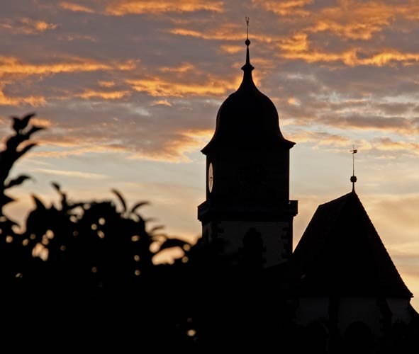 Georgskirche mit Dohlen bei Sonnenuntergang (Schön rot, Danke an den isländischen Vulkan Eyafjallajökull) mehr über unsere → Dohlen im Glemstal |