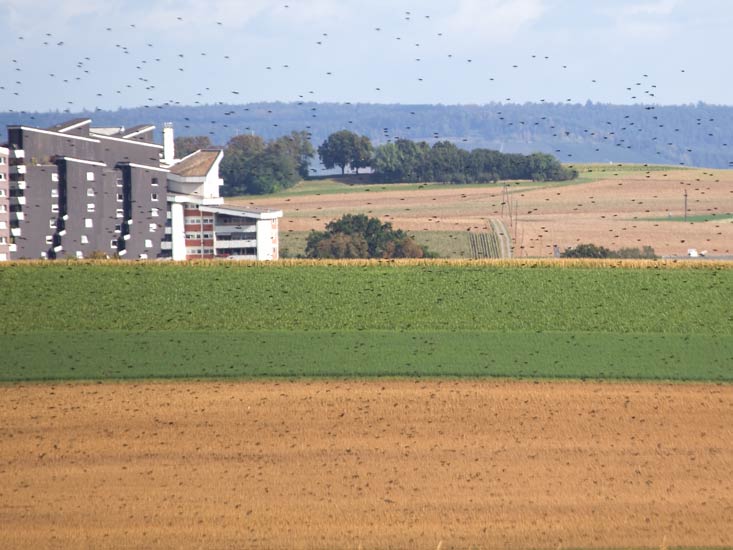 Blick Richtung Norden zur Katharinenlinde in Schwieberdingen Vögel sieht man vor dem hellen Himmel am besten! dann folgt der ferne Hintergrund und das Stoppelfeld. Am schlechtesten ist die Hemminger Bebauung |