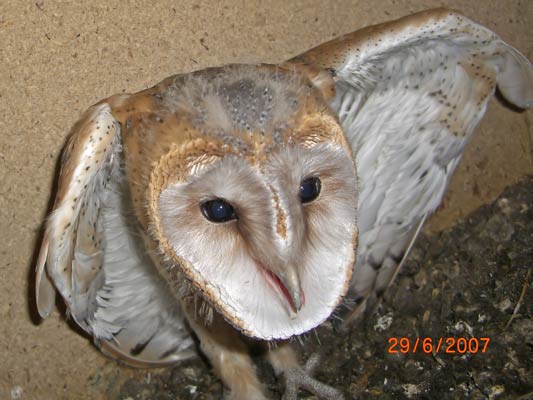 ... mehr Mehr über unsere Schleiereulen im Glemstal (Tyto alba) [Foto: junge Schleiereule im Eulenkasten von Ernst Seitz fotografiert, in Markgröningen, Juni 2007]