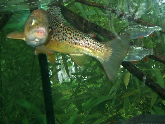 gefangen und gezeigt. Der Hecht im Aquarium habe morgens eine kleine Bachforelle