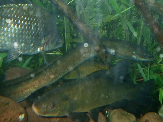 größeren Gruppen. Hinten sind zwei Karpfen. Ganz vorne im Bild könnte eine