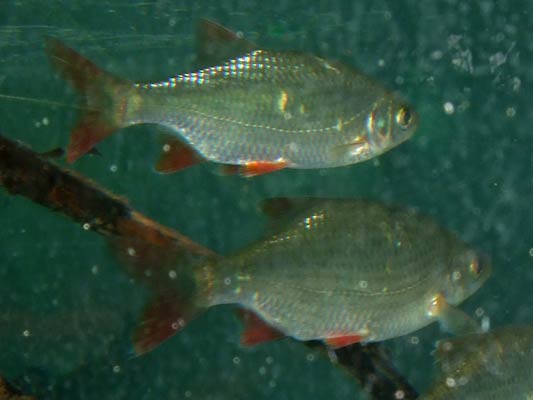 10 cm langen Rotfedern. Im Teich des NABU Markgröningen wohnen 2006 viele kleinere ca. 10cm lange Fische. (Rotfedern)