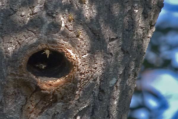 aufgehängt. Wird offenbar gut von Wildbienen angenommen, denn der Specht hat