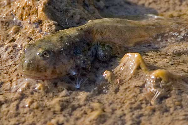 Körper, kurzer Schwanz, Flecken. Diese Kennzeichen sind bei der Kaulquappe unten
