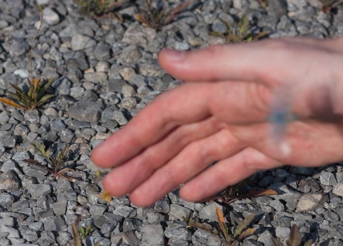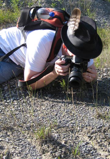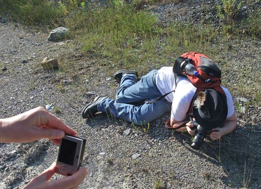 Schotter aktiv. Hier das "Making of": Andreas fotografiert eine Ödlandschrecke. Links der Foto von Susanne |