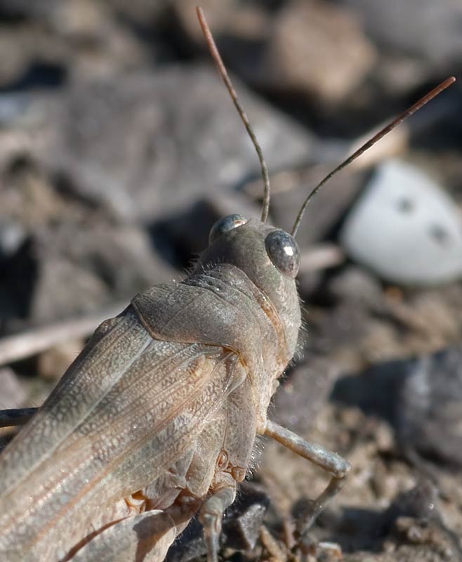 (Oedipoda caerulescens) von der Seite und von vorne (super getarnt)