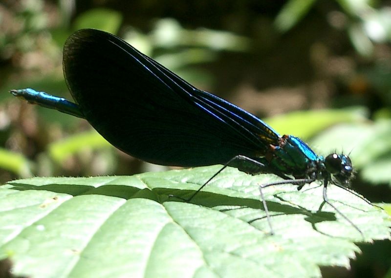 Die Prachtlibellen leben nur an Fliessgewässern. Wenn sie dicht über der Wasseroberfläche über die Glems fliegen, sehen sie fast aus wie große schwarze Schmetterlinge. Am häufigsten sieht man die männlichen Blauflügel-Prachtlibelle. Wohingegen ich das entsprechende Weibchen erst einmal gesehen habe. Erstaunlich!