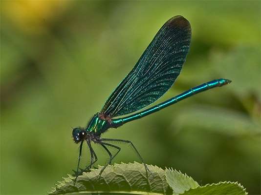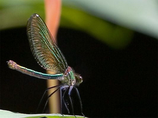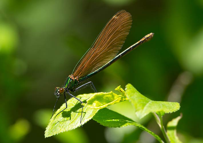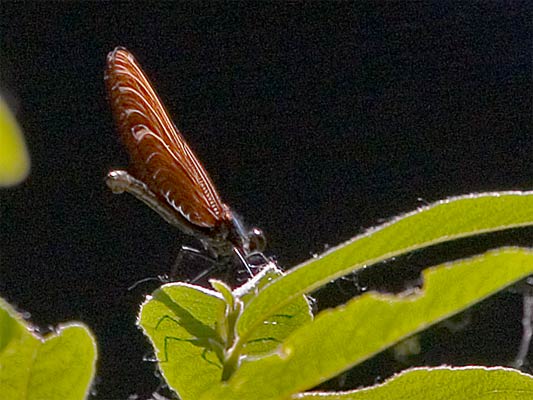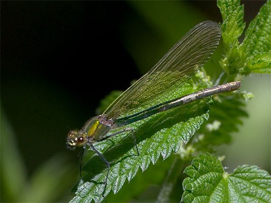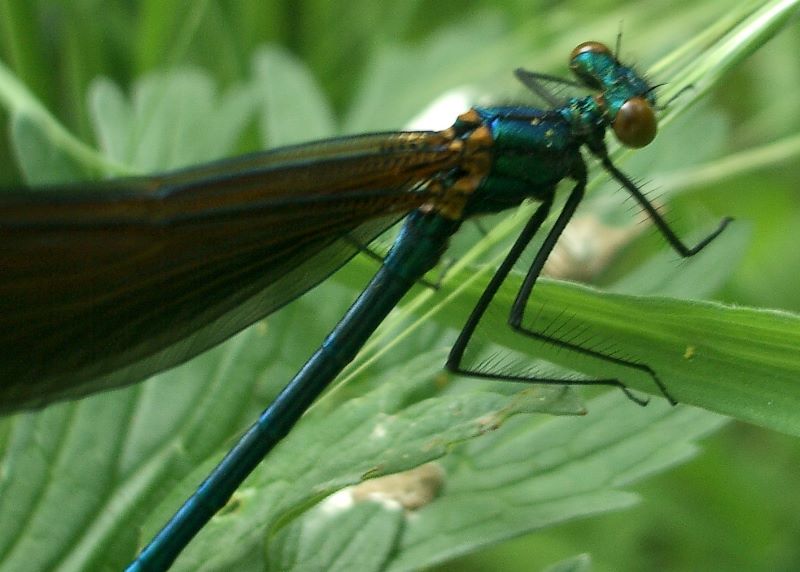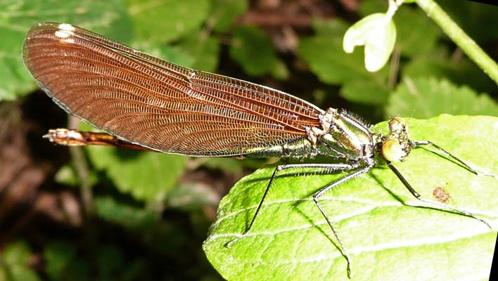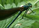 | blauflügelige Prachtlibelle, w. (Caleopteryx virgo) mit gelben Augen (Danke an Norbert Baasner für die Artbestimmung in 6.2013) ...mehr über das → Glemstal zwischen Schwieberdingen und Markgröningen |