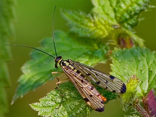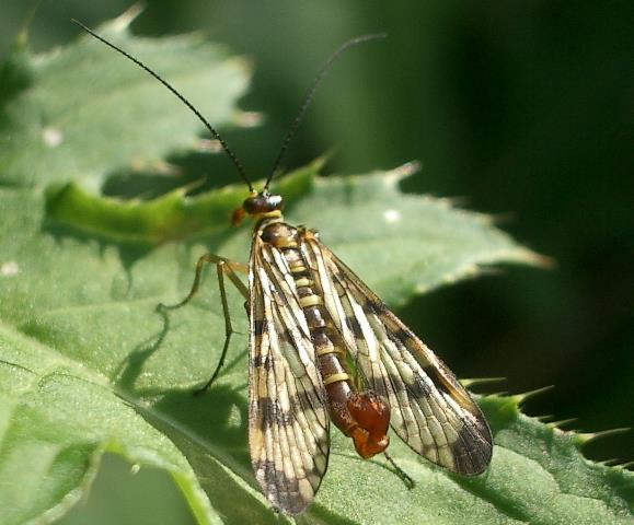 Panorpa communis | gemeine Skorpionsfliege (Panorpa communis, männlich wg der Zange am Hinterleib) |