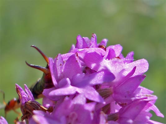 Orchidee Pyramiden-Hundswurz (Anacamptis pyramidalis) auf Heide 1 im Siegental mit Ohrwurm (forficula auricularia) ...mehr über unsere → Orchideen-im-Glemstal → Heiden-im-Siegental |