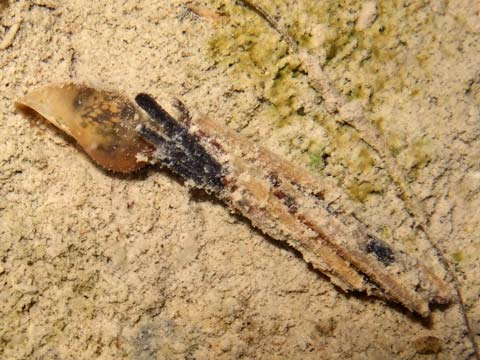 | eine Art lebendes Aststück: eine Köcherfliegenlarve, gehört zur Begleitfauna zu Feuersalamanderlarven, vermutlich Silo nigricornis. Zusammen mit Bachflohkrebsen → Feuersalamander im Glemstal |