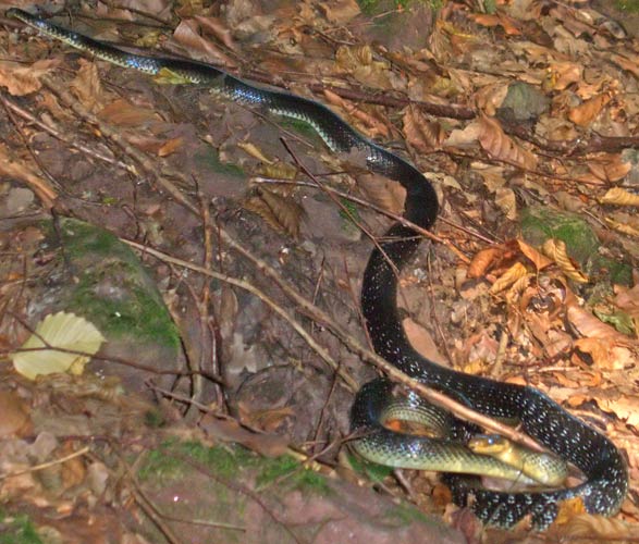 schwarze Schlange. Foto sehr undeutlich. vermutlich Ringelnatter