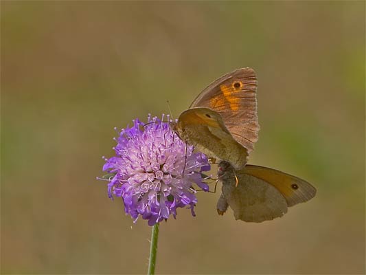 Größenvergleich: Großes Ochsenauge (maniola jurtina) und Kleines Wiesenvögelchen (coenonympha pamphilus) auf Acker-Witwenblume (knautia arvensis) ...mehr über unsere → Kardengewächse im Glemstal |