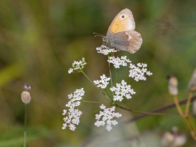 ein kleiner Heufalter (Coenonympha pamphilus) auf Dost am Heimberg ...mehr über unseren → Heimberg in Schwieberd. |