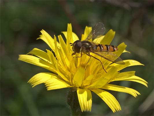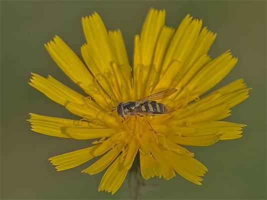 | Mondfleck-Schwebfliege (Lapposyrphus lapponicus) auf Wiesenpippau ... mehr über → Korbblütler im Glemstal |