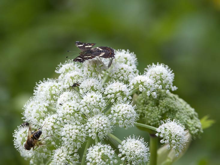 links Keilfleck-Schwebfliege (Eristalis pertinax) oben Landkärtchen (Araschnia levana) auf Wald-Engelwurz (Angelica sylvestris) ...mehr über unsere → Doldenblütler im Glemstal → Edelfalter im Glemstal |