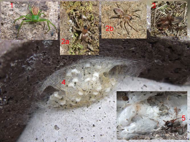 entdeckt haben: 2a/2b: aus der Familie der Sechsaugenspinnen (Dysdera sp.)? 5: aus der Familie der Sechsaugenspinnen (Dysdera sp.)? 1: grüne Krabbenspinne (Diaea dorsata F)!3: unbekannte Spinnenfamilie 4: eine Art Eierkokon |