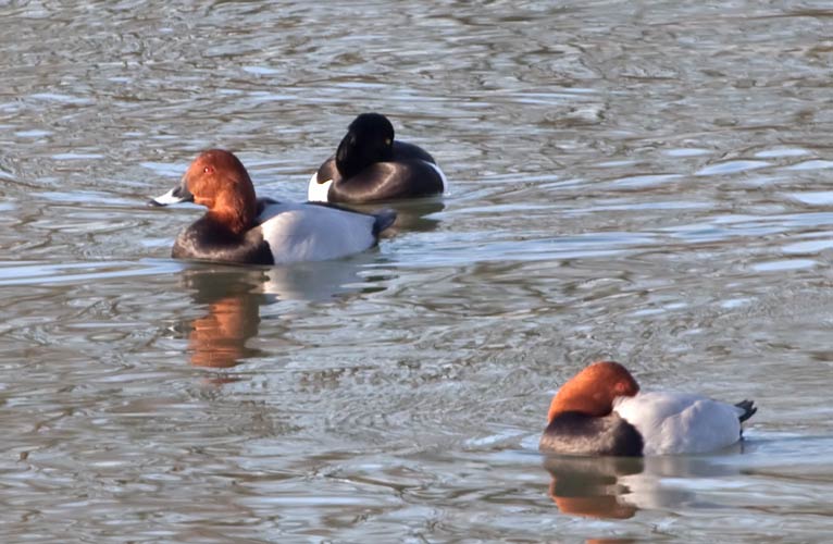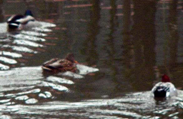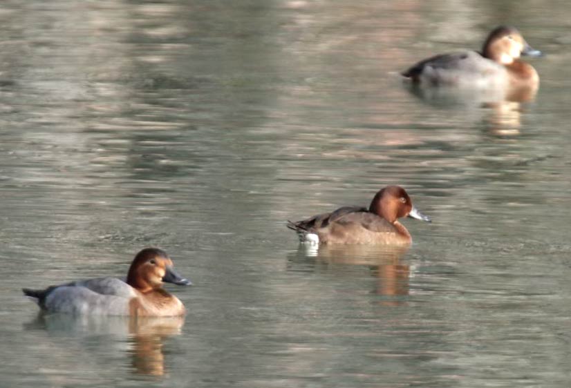 in der Mitte: weibliche Moorente (Aythya nyroca) im Neckarkanal Pleidelsheim. Und zwei weibl. Tafelenten (Aythya ferina) (Danke an Jochen Völlm für die Artbestimmung in 2/2011) |