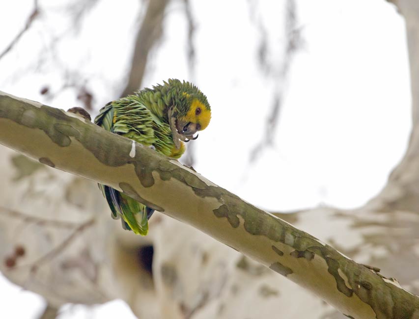 uns die Papageien auf den Platanen auf. Es handelt sich um Gelbkopfamazonen (Amazona