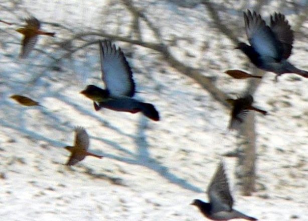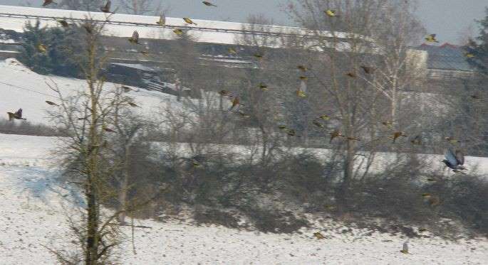 Tauben und Goldammern fliegen zusammen weg | die Tauben fliegen dann weiter zur ICE-Brücke |