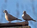 Türkentauben auf einem Balken - eine im Nest und eine war im Efeu kurz