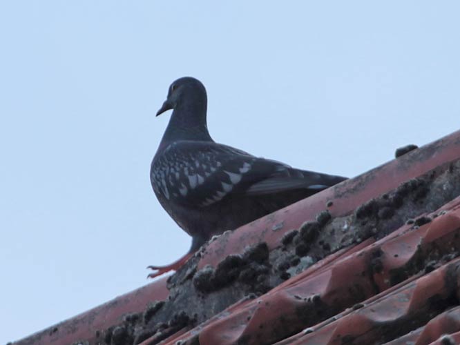 3 1/2 Jahre später als das Foto links: Auf dem Dach der Neumühle saß diese einzelne Taube. Sieht genau aus wie auf dem Foto links | Straßentauben auf der Kirche in Uri |
