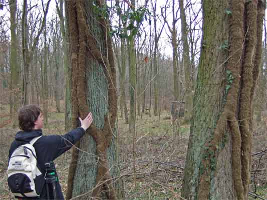 im winterlichen Wald an Baumstämmen sitzend sehen.