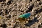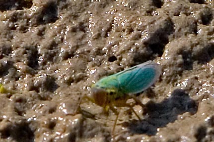 auffällig blaugrünes, aber kleines Insekt im Schlamm des Gelbbauchunkentümpels Binsen-Schmuckzikade (Cicadella viridis) ...mehr über unsere → Zikadenarten im Glemstal |