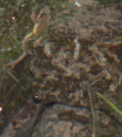Ein Braunfrosch unten eine Feuersalamanderlarve | Der gleiche Braunfrosch. evtl. Wasserfrosch (?) |