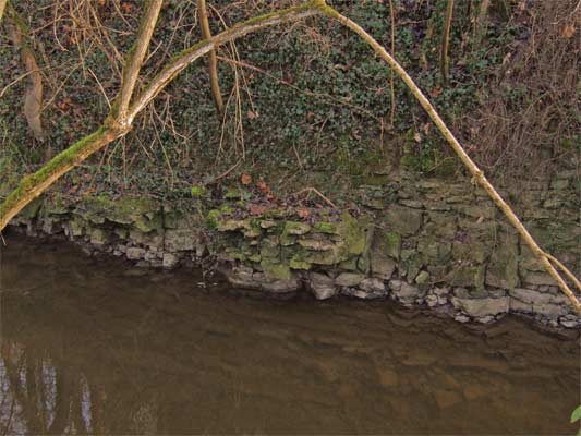 tief eingesägt, so dass er an den Prallhängen an wenigen Stellen zu Tage tritt.