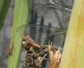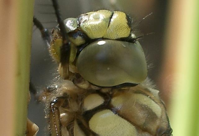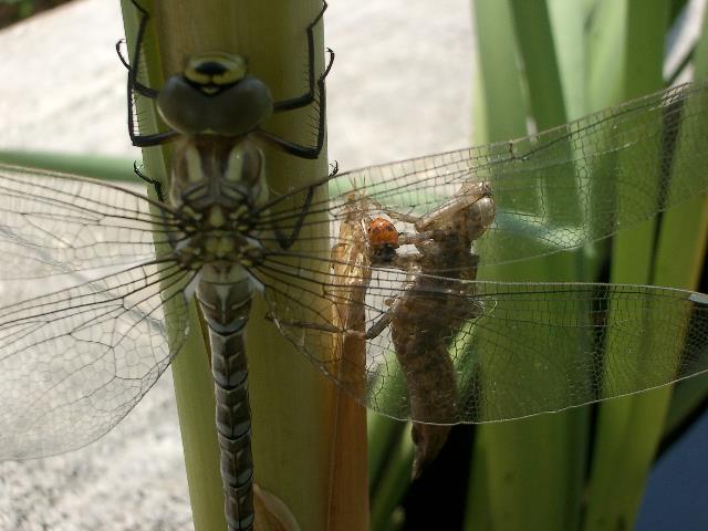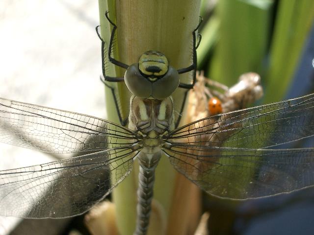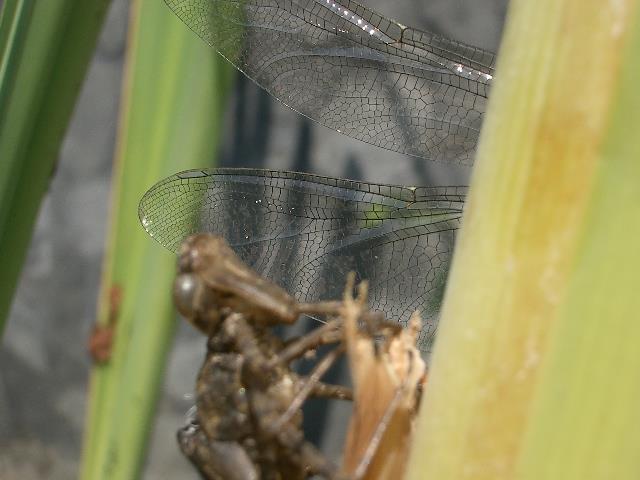 Flug. Die Imago sitzt dabei selbst im Schatten des Schilfrohrs. Dadurch sind die Flügel maximal in der Sonne |