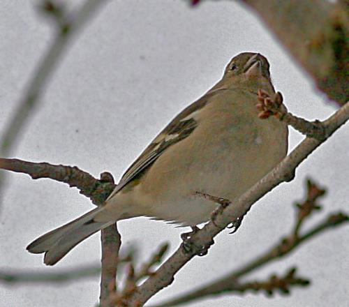 Buchfink, weibl. singt bei Schneefall → Buchfink-im-Glemstal |