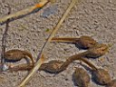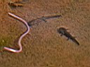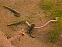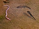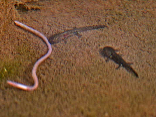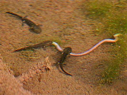 sieht man, wie die Feuersalamanderlarven im kühlen Brünnle einen Wurm angreifen.