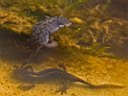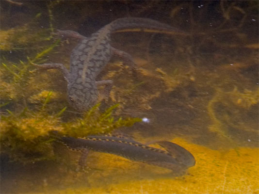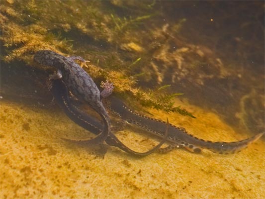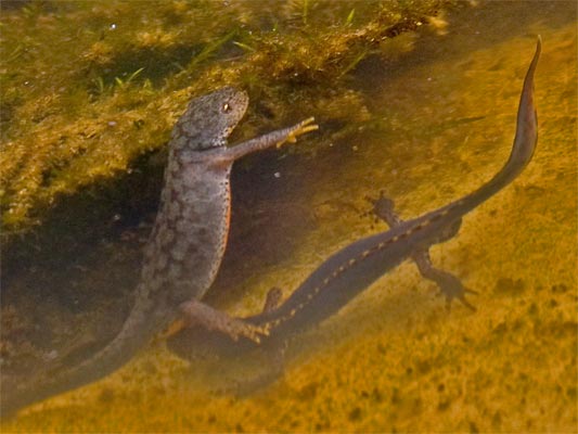 | Bergmolche: 6: er fächelt mit dem Schwanz Duftstoffe in ihre Richtung |