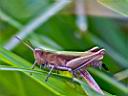 Man sieht viele braune Grashüpfer. Dieser hier ist laut Google ein "chorthippus