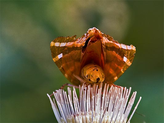 War mir eigentlich fast sicher, daß das Objekt links nur ein vertrockneter Grashalm ist. Erst bei sehr genauem Hinschauen sieht man die Beine. Ein echter Tarnspezialist!