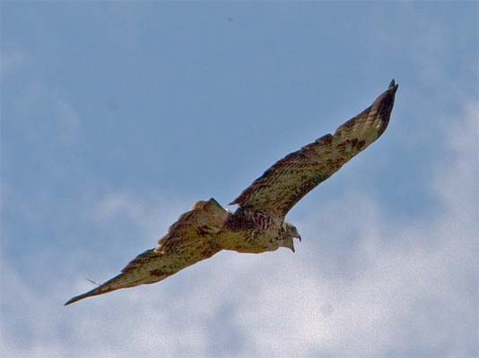 | Luftkampf: unten: junger Mäusebussard oben: Rotmilan (kein Jungvogel) (Danke an Jochen und Christoph Völlm für den Hinweis vom Dez. 2010, dass der Mäusebussard ein Jungvogel ist, der Rotmilan aber nicht). |