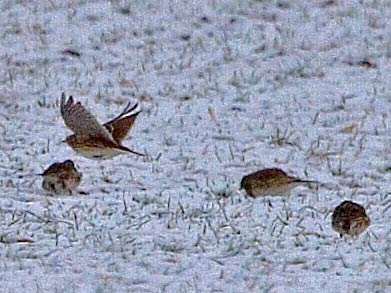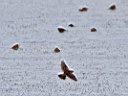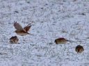 Ein Schwarm mit ca. 40 Vögeln war auf dem verschneiten Feld neben dem