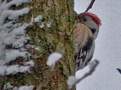 Mittelspecht unten. Der Mittelspecht ist an der roten Kappe ohne schwarzen Rand