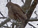 Der Mäusebussard ist in dichtem Schneegestöber fotografiert. Ringeltauben sah